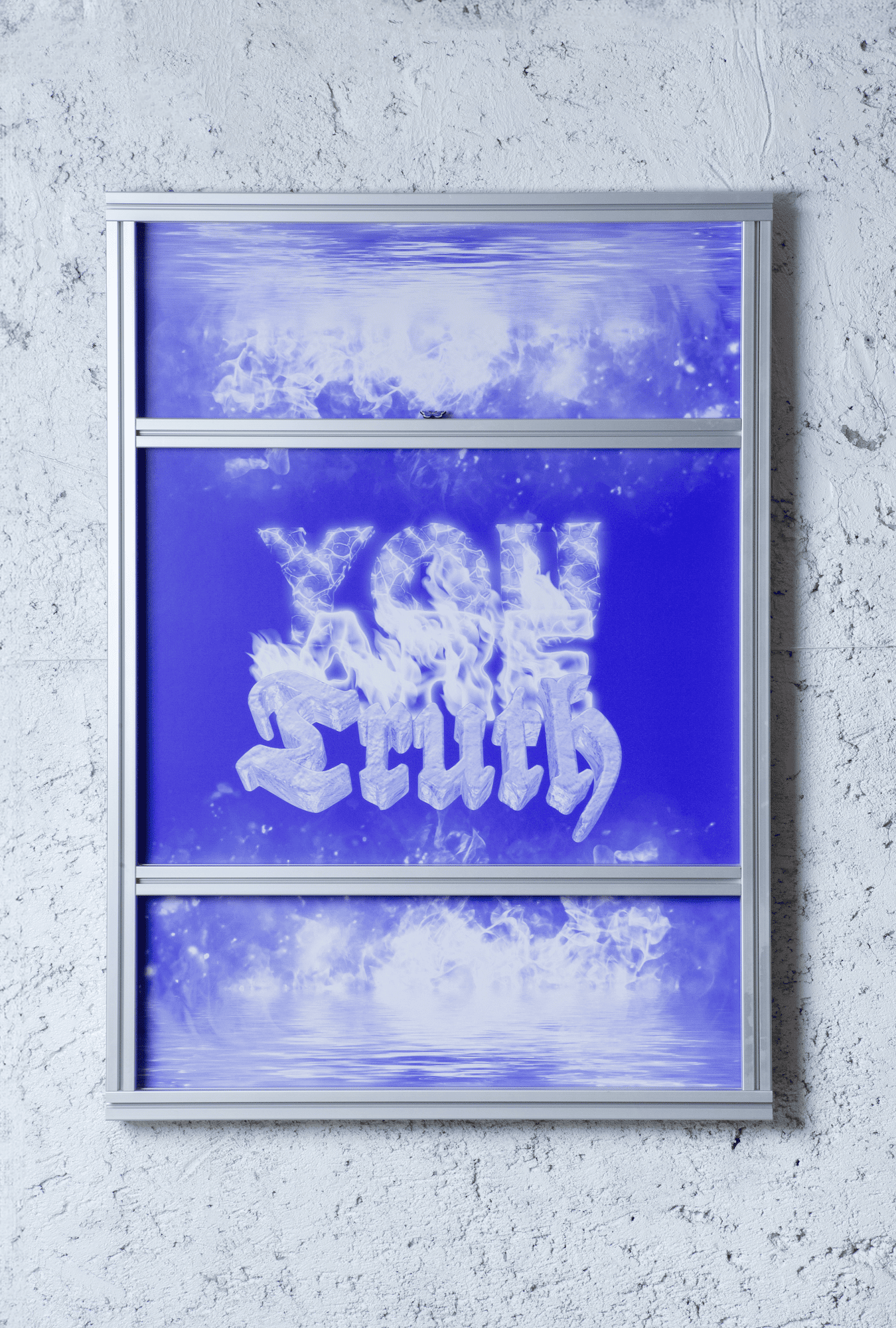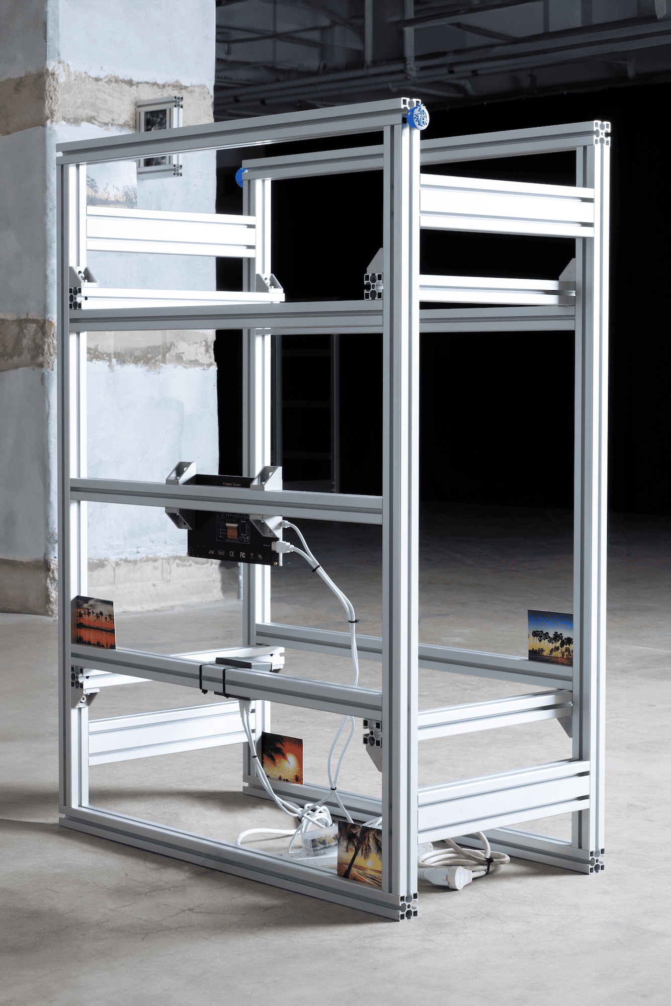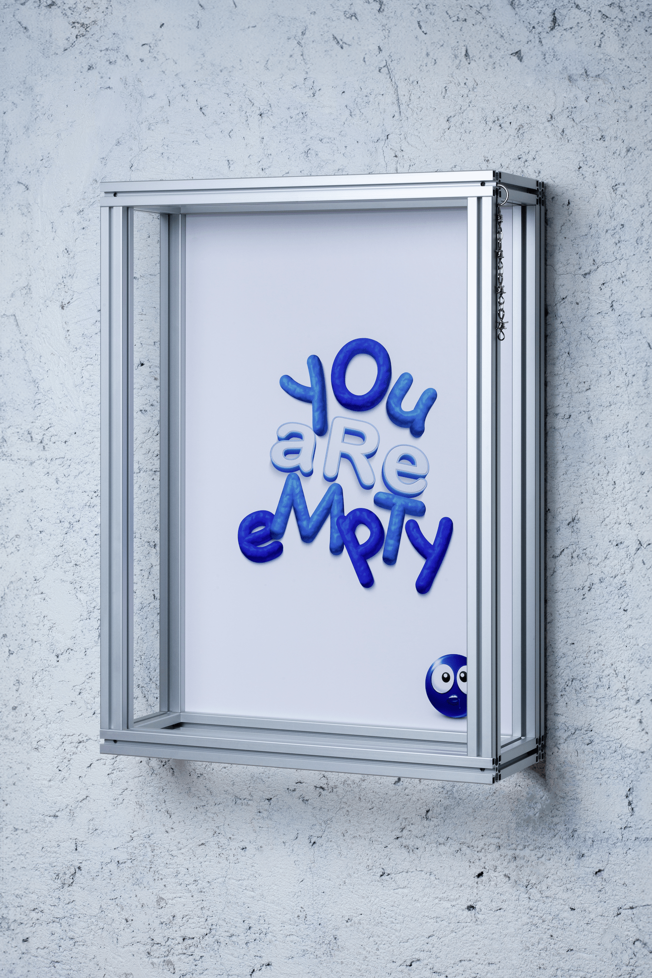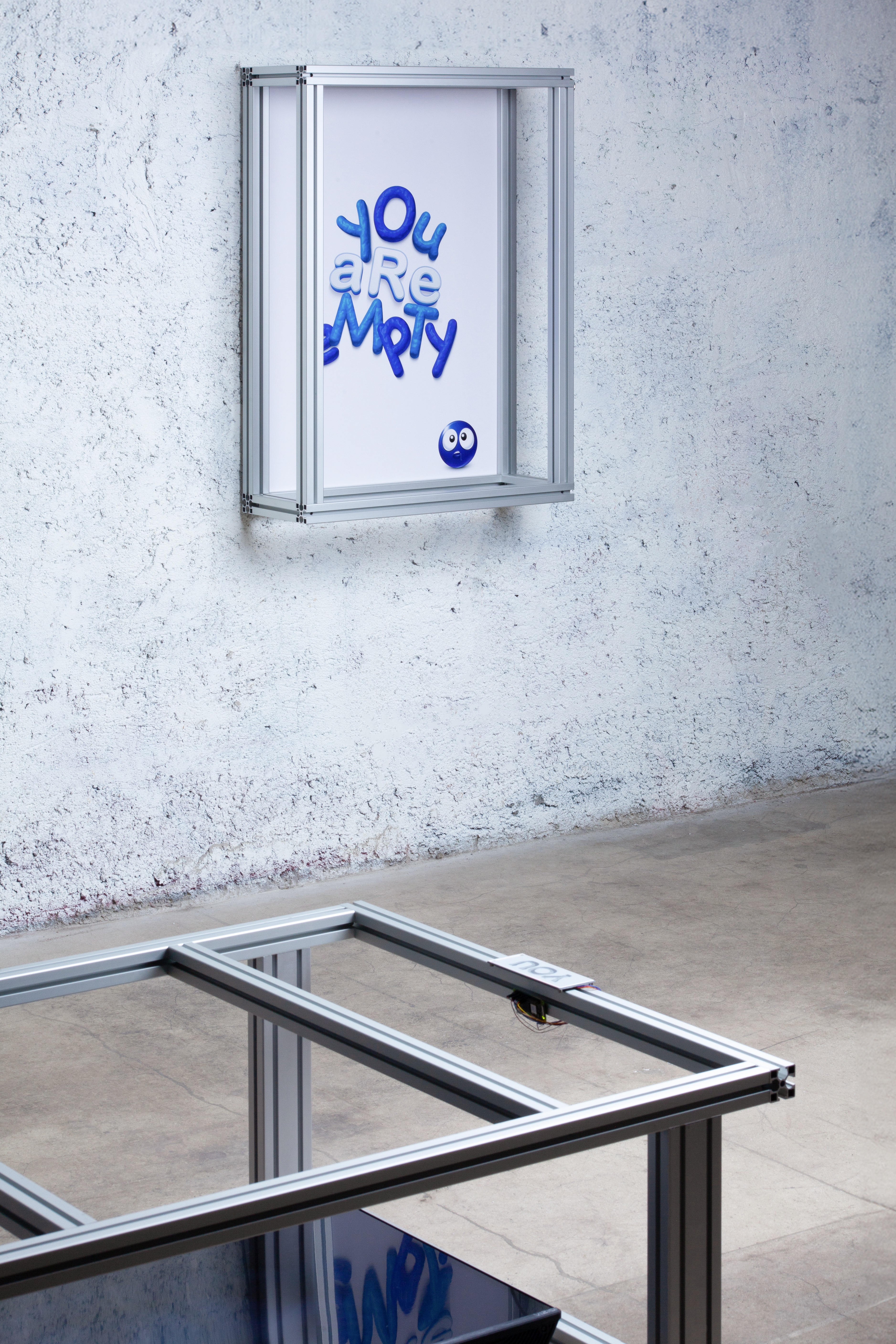 Fournier uses elements of internet visual language—such as the decaying aesthetics of deep-fried memes and sad emojis—with a range of industrial materials like server racks, TV mounts, and aluminum frames, evoking the erosion of meaning amplified by Basar’s daring slogans. Live webcam feeds of deserted, paradisiacal beaches—once symbols of escape—now suggest a haunting sense of loss and disconnection, reinforcing the exhibition’s themes of unavoidable loneliness and the fleeting tension between *reel* and *possible* experiences.